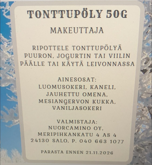Joulukauppamme on jälleen avattu… tonttupölyä puuron, jogurtin tai viilin päälle. Käytä mausteena leivonnassa ja ruoanlaitossa. Tuote sisältää luomusokeria, kuivattua ja jauhettua omenaa, kanelia, mesiangervonkukkaa ja vaniljasokeria. Tilaus valittavissa postin kautta tai nouto meiltä Salosta Meripihkankadulta.